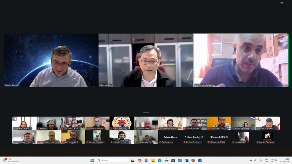 (ANS - Roma) – El martes 21 de octubre de 2025, los Delegados de Comunicación Social (CS) de la Región Interamérica y Cono Sur se reunieron de forma virtual bajo la guía del Padre Fidel Orendain, Consejero General del Sector. El encuentro, moderado por el padre Ricardo Cámpoli, miembro del Sector de Comunicación, se centró en compartir actualizaciones, conocer las expectativas y prioridades para los próximos años, y la reorganización del Sector, definiendo las estrategias futuras para fortalecer la misión en este ámbito.