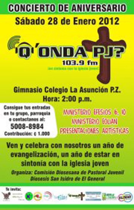 Pérez Zeledón, enero 2012.- La Comisión Diocesana de Pastoral Juvenil (CDPJ) celebrará el primer aniversario del programa radial: “Q´ONDA PJ”. Se ralizará un concierto el sábado 28 de enero, en el Gimnasio del Colegio La Asunción, a partir de las 2:00 PM. Más información en el afiche.