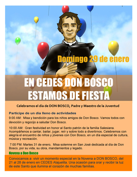San José, enero 2012.- CEDES Don Bosco invita a un día lleno de actividades para celebrar la novena de San Juan Bosco. Más información en el afiche.