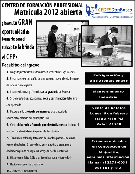 Costa Rica, febrero 2012.- El Centro de Formación Profesional en Alajuelita abre sus puertas con una gran oferta académica. Si desea más información despliega el afiche.