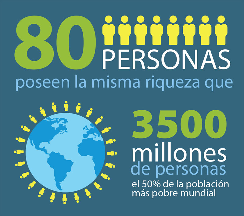 80 personas poseen la misma riqueza que el 50% más pobre de la población mundial; esto quiere decir que 3,500 millones de personas comparten la misma cantidad de riqueza que estas 80 personas enormemente ricas.