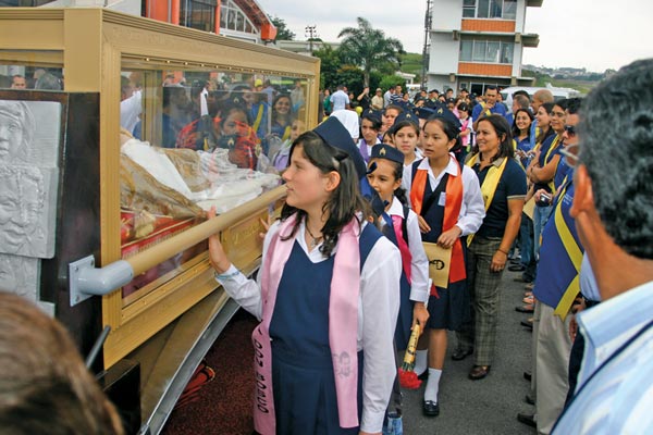Tuve la oportunidad de transportar la urna en su entrada a los patios del Colegio Salesiano Santa Cecilia. Ante un ambiente tan festivo, con miles de jóvenes saltando y cantándole al Santo de la Juventud, tuve un momento de reflexión muy profundo. Ver que la urna iba impulsada por jóvenes de las distintas instituciones educativas y grupos juveniles me dejó muy claro que toda la obra salesiana tiene como motor y razón de ser los jóvenes; que somos nosotros quienes debemos formarnos y trabajar por que siga creciendo; y que de nosotros mismos deben surgir las distintas vocaciones para cumplir el sueño de Don Bosco. El me ha dejado una invitación clara y haré mi mayor esfuerzo por seguirla: Estar siempre alegre y de esa manera llegar a ser como él, ser santo.