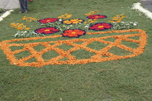 Nuevamente debió Don Bosco transitar sobre artísticas alfombras vegetales que aludían a diversos temas salesianos. Los guatemaltecos son muy hábiles en expresar su fe con esas elaboradas alfombras de buen gusto artístico.