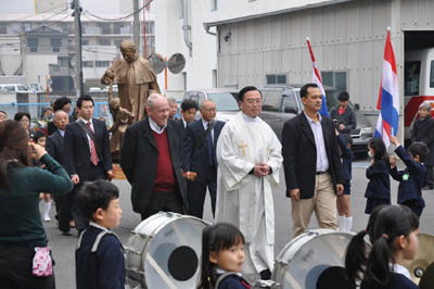 En Hamamatsu, sede de una gran comunidad de inmigrantes, sobre todo brasileños y filipinos, la estatua de Don Bosco fue llevada en procesión al Centro Parroquial hasta la parroquia, dentro de un solemne “mikoshi”, un templete en baldosín utilizado para las fiestas religiosas. Grandísima la participación de los fieles, sea a la misa en la parroquia, sea a las confesiones administradas en Japonés, Portugués, Español e Inglés.