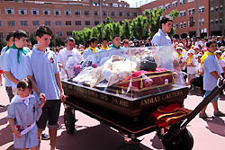 Madrid, Junio 2012.- Ayer, 6 de junio, la urna con la reliquia de San Juan Bosco atravesaba el portón del colegio de Atocha, para comenzar oficialmente su recorrido por las obras salesianas de la Inspectoría de Madrid, que se prolongará hasta el próximo 24 de junio. En el recibimiento estaban presentes el Cardenal Antonio María Rouco Varela Arzobispo de Madrid y el padre Luis Onrubia Inspector de Madrid.