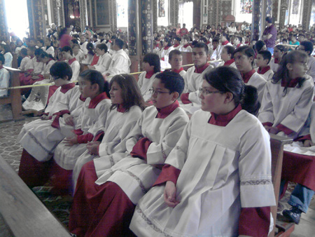 Costa Rica, Cartago, julio 2011.- Más de setecientos acólitos desfilaron en alegre procesión de niños y jóvenes con sus coloridos ornamentos desde la catedral hacia la Basílica de los Ángeles.