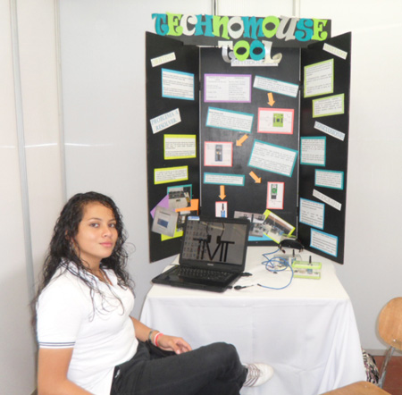 La excelencia académica también se reflejó en Ana Victoria Solís y Karen Zúñiga, del Colegio Técnico Don Bosco, ganaron con su Techno Mouse Tool en la categoría de ingeniería eléctrica y electrónica. Este es un dispositivo que se pone en la frente y permite maniobrar el cursor del ratón de la computadora.