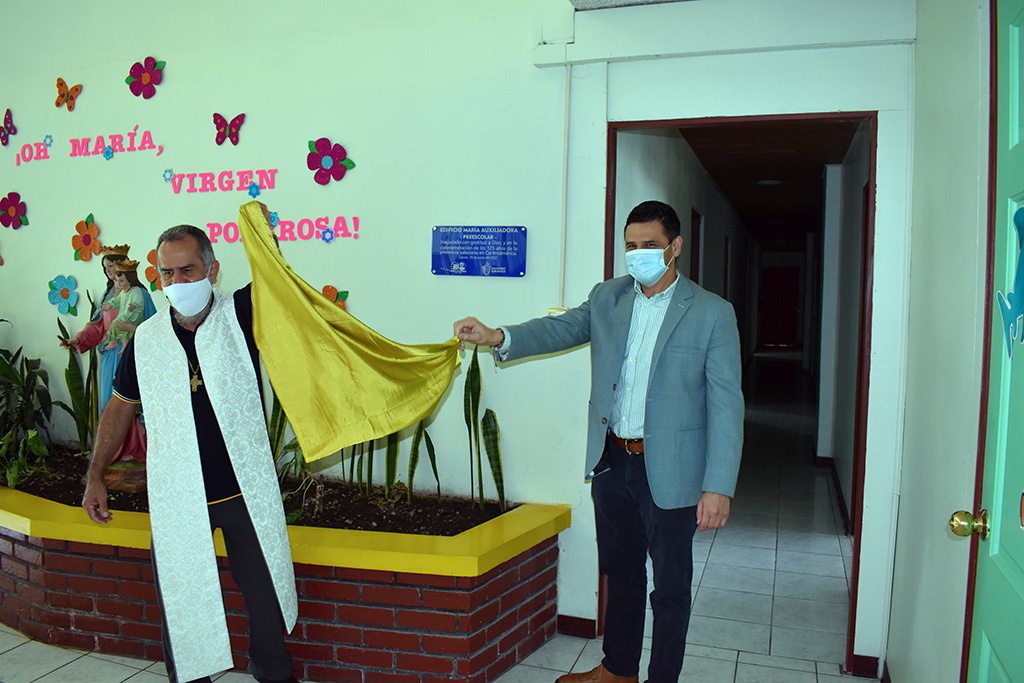 Inició con la motivación del director general, Laurens Torres Artavia, y seguidamente el padre Prado dirigió la bendición del edificio y de los presentes, para luego develar la placa que estará junto al sitio de veneración a María Auxiliadora con el que cuenta el Preescolar.