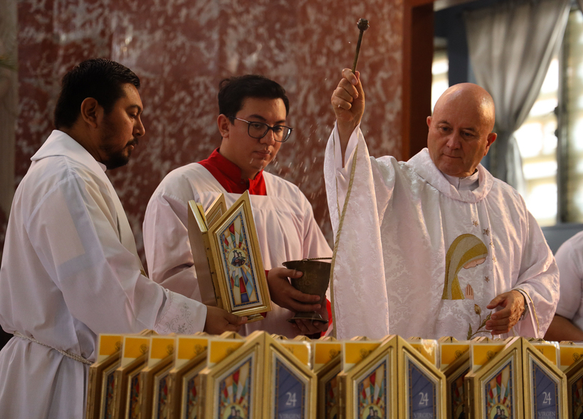 El padre Jara junto al padre Cubías bendijeron las imágenes y las entregaron a los representantes de cada sección de todos los niveles, quienes llevan la misión pastoral de hacerla llegar a todos los hogares de sus compañeros.