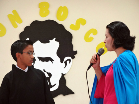 Los niños y jóvenes de sexto y séptimo fueron los encargados de guiar a sus compañeros durante el acto. Don Bosco mismo fue el presentador para este día en el cual se pudo disfrutar de poemas, cantos, dramatización y reflexión.