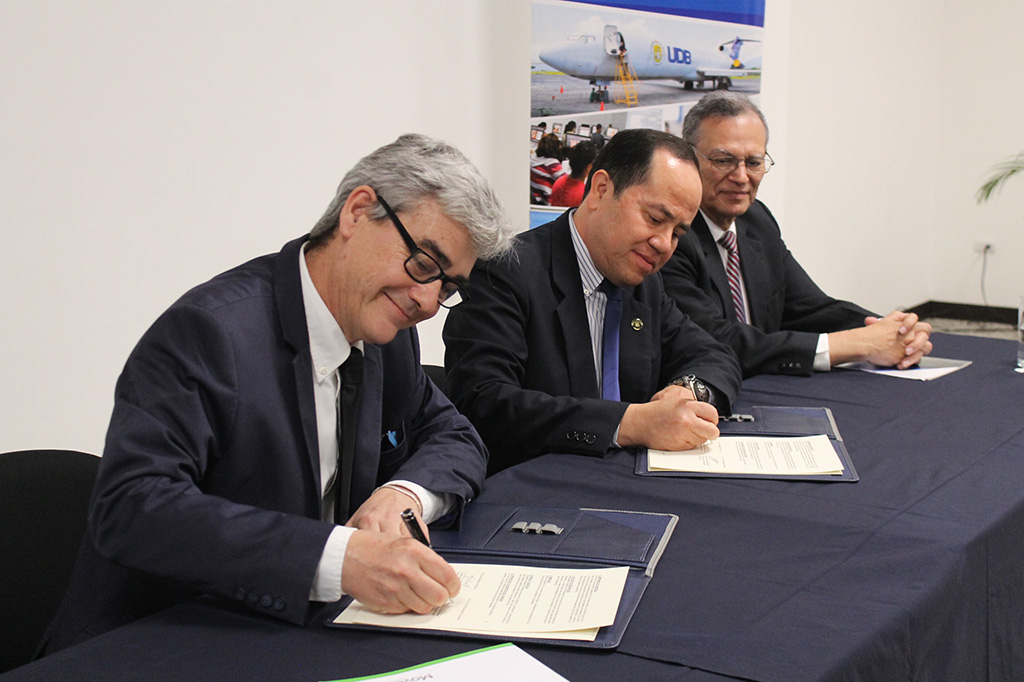 El convenio fue suscrito por el Sr. Max Deneu, Director de operaciones de ICRC-MoveAbility Foundation, con sede en Ginebra; y el Dr. Mario Rafael Olmos, rector de la UDB, en presencia del Sr. Michel Deffontaines, jefe de programa regional para Latinoamérica y el Dr. Rolando Martínez Panameño, decano de la Facultad de Ciencias de la Rehabilitación.
