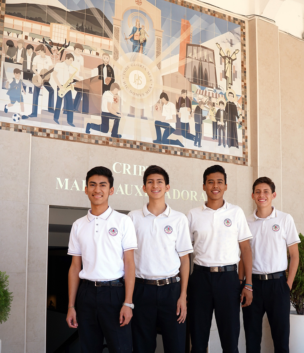 Stanley Méndez Renderos, Diego Portillo Cabrera, Melvin Salazar Campos y Dylan Siliézar Duarte son los jóvenes talento que han plasmado la Espiritualidad Juvenil Salesiana en un mural que embellece la entrada de la recién remodelada Cripta María Auxiliadora.