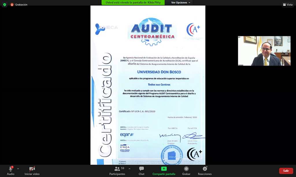 Dicha certificación fue otorgada por el Consejo Centroamericano de Acreditación de la Educación Superior (CCA), y la Agencia Nacional de Evaluación de la Calidad y Acreditación (ANECA), de España, en una ceremonia virtual.