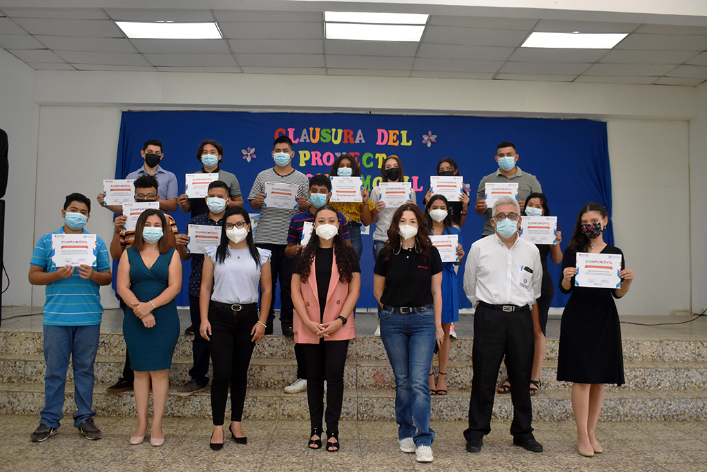 San Miguel, febrero 2022. -La sede de FUSALMO en San Miguel celebró la graduación de los jóvenes beneficiarios del proyecto COMPUMÓVIL.