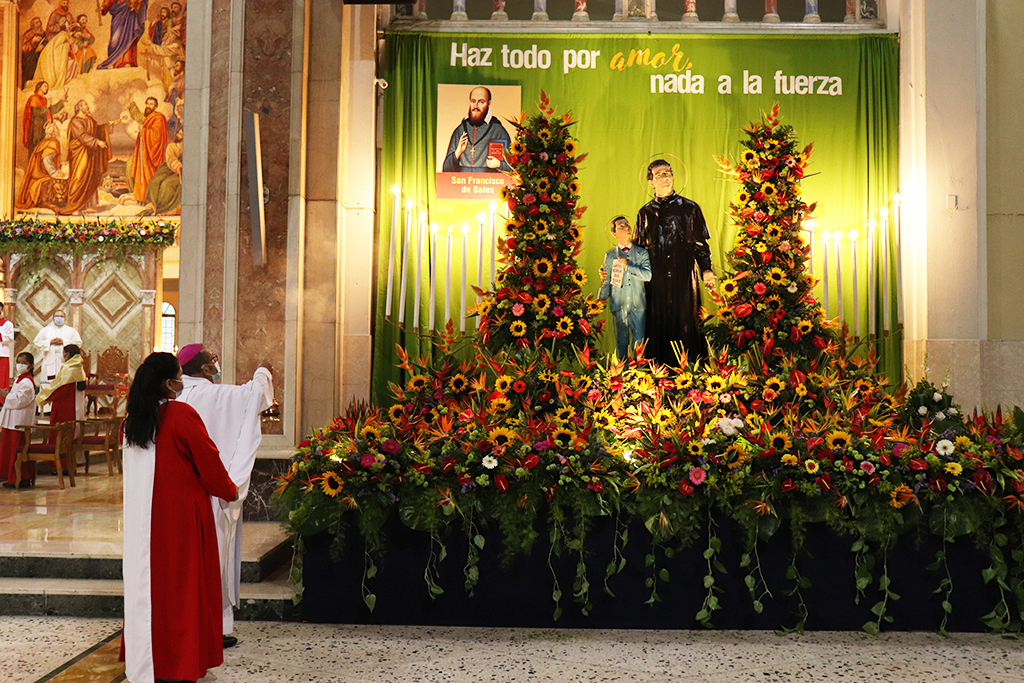 Desde el 22 de enero, inicio de la novena, el templo se adornó con flores y con el altar dedicado al santo de la juventud; en él se colocó una imagen de San Francisco de Sales y la frase del Aguinaldo del Rector Mayor para este año: “Haz todo por amor, nada a la fuerza”.