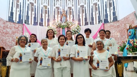 El Salvador, Santa Tecla, mayo 2023.- El día 24 mayo en la celebración de la fiesta de María Auxiliadora de la comunidad del colegio Santa Cecilia, doce nuevas integrantes de ADMA hicieron la promesa pública de promover la veneración al santísimo sacramento, la devoción a María Auxiliadora y la promoción de las vocaciones.