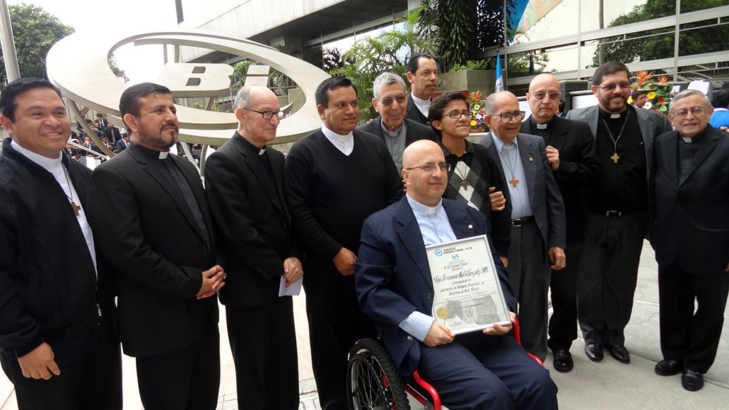 Guatemala, junio 2016.- El viernes 24 de este mes, en la sede del Banco Industrial, se homenajeó al Padre Luis Fernando Dubón, de la Parroquia La Divina Providencia a izar la bandera nacional como parte de los festejos del Día Internacional del Exalumno Salesiano.