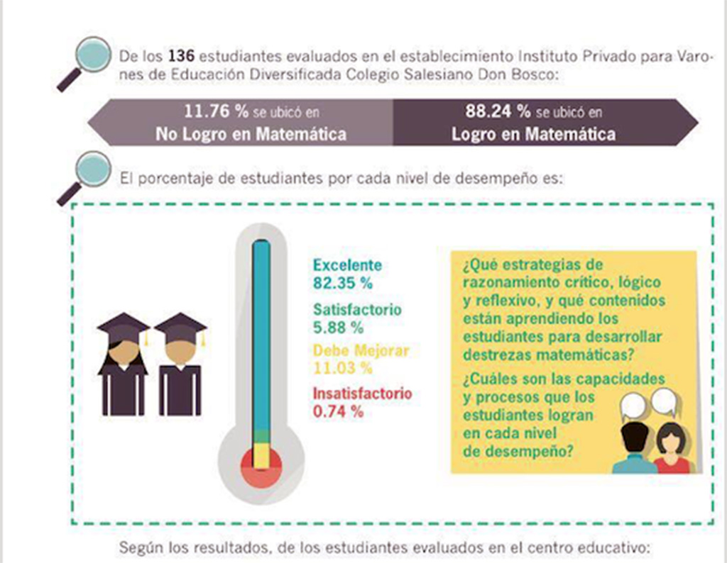 Según las pruebas ministeriales del año 2016 el colegio obtuvo un porcentaje excelente en las asignaturas de Matemáticas y Lectura. Después de las evaluaciones de los alumnos se constató que 82.35 % de los alumnos del colegio tienen conocimientos de Matemáticas y el 97.79 % de la población total es excelente en lectura.