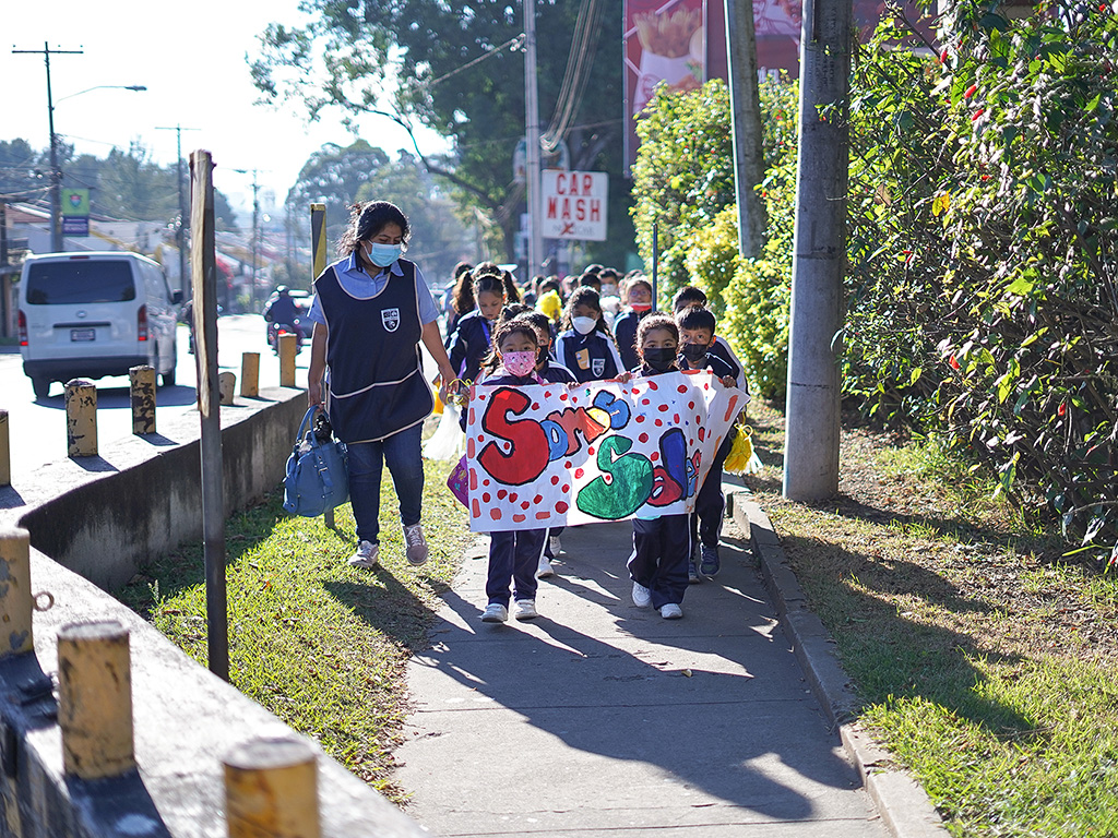 Ciudad de Guatemala, febrero 2023. - Con gritos de alegría, porras, cantos y coreografías, los alumnos del Centro Escolar Miguel Magone se hicieron presente para celebrar la fiesta del Padre y Maestro de la Juventud: Don Bosco.