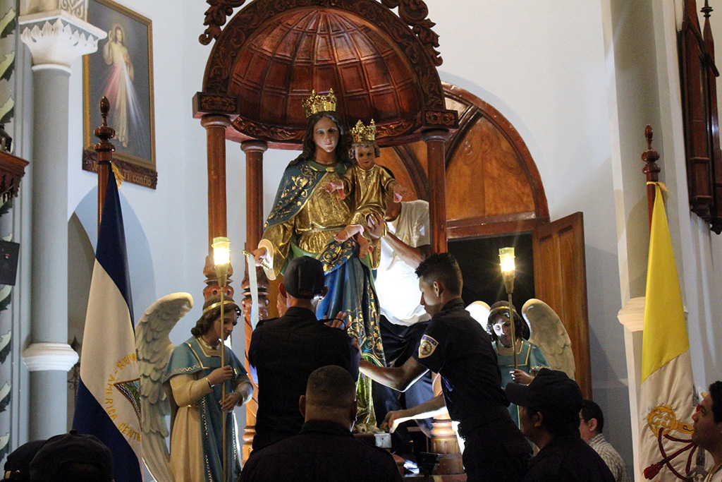 Después entró el cuerpo de bomberos de la Villa a rendirle honores a su patrona, sonaron las campanas... Los himnos a la Reina de Granada resonaron en todo el templo... Los fieles alzan sus pañuelos saludando la venerada Imagen que pasa en frente de ellos derramando las bendiciones del Señor... La imagen llegó a su altar mientras todos gritaban ¡Viva María Auxiliadora!