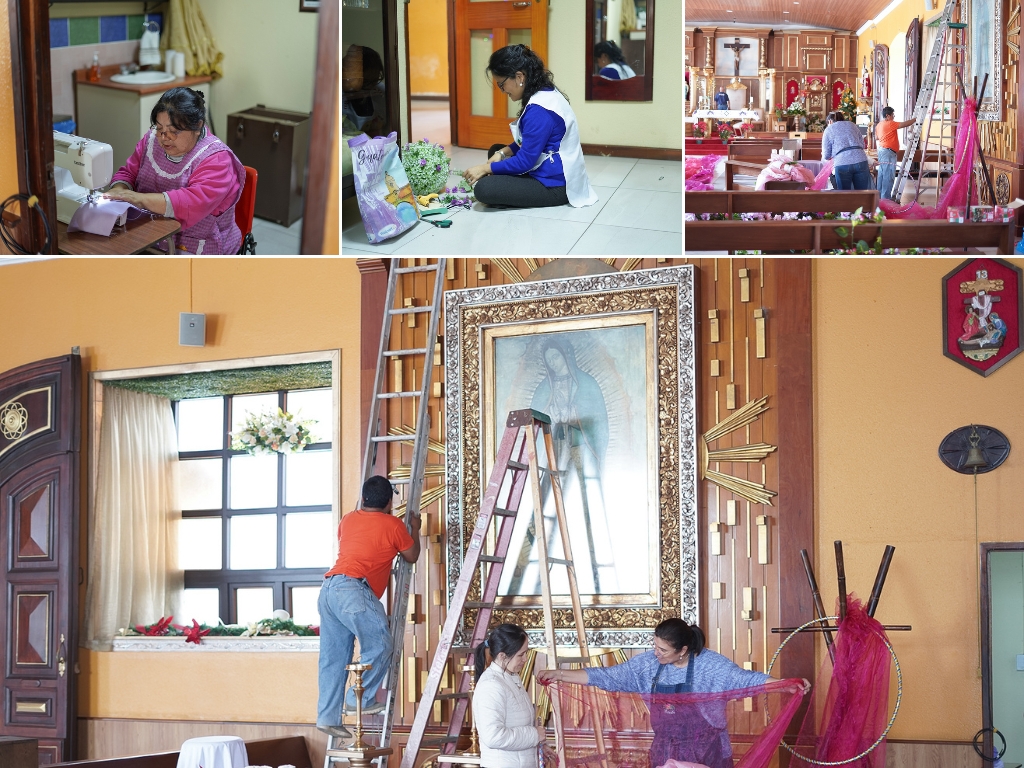 Ciudad de Guatemala, Guatemala, diciembre 2023 . - La comisión de Piedad Popular de la parroquia El Espíritu Santo, se encuentra trabajando para engalanar el altar de la Virgen de Guadalupe para su fiesta este próximo 12 de diciembre. Cortinas en tonalidades fucsia, arreglos florales, velas, son algunos de los elementos que están colocando para que la Emperatriz de América, luzca sus mejores galas para recibir a sus devotos que la visitan desde tempranas horas en su día.