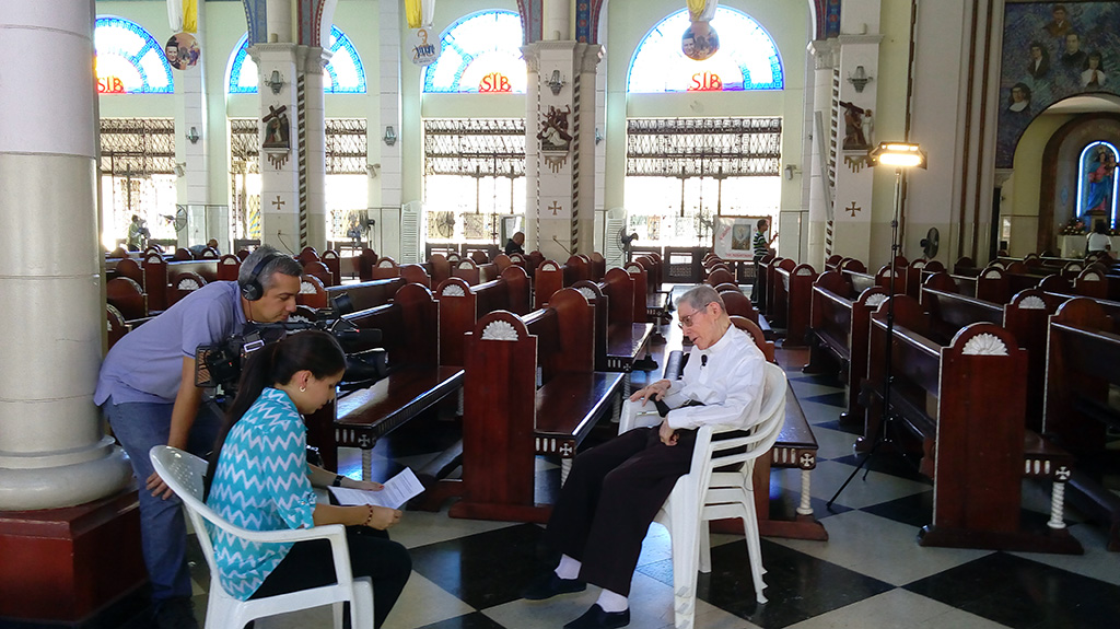 Panamá, abril 2016.- La urna de Don Bosco ha sido donada a la Basílica Don Bosco. El P. Catedral atiende a periodistas que lo entrevistan sobre la venida de la Urna que se mantendrá en una capilla de la Basílica. Se traerá desde aeropuerto de Tocumen el sábado 16 de abril.