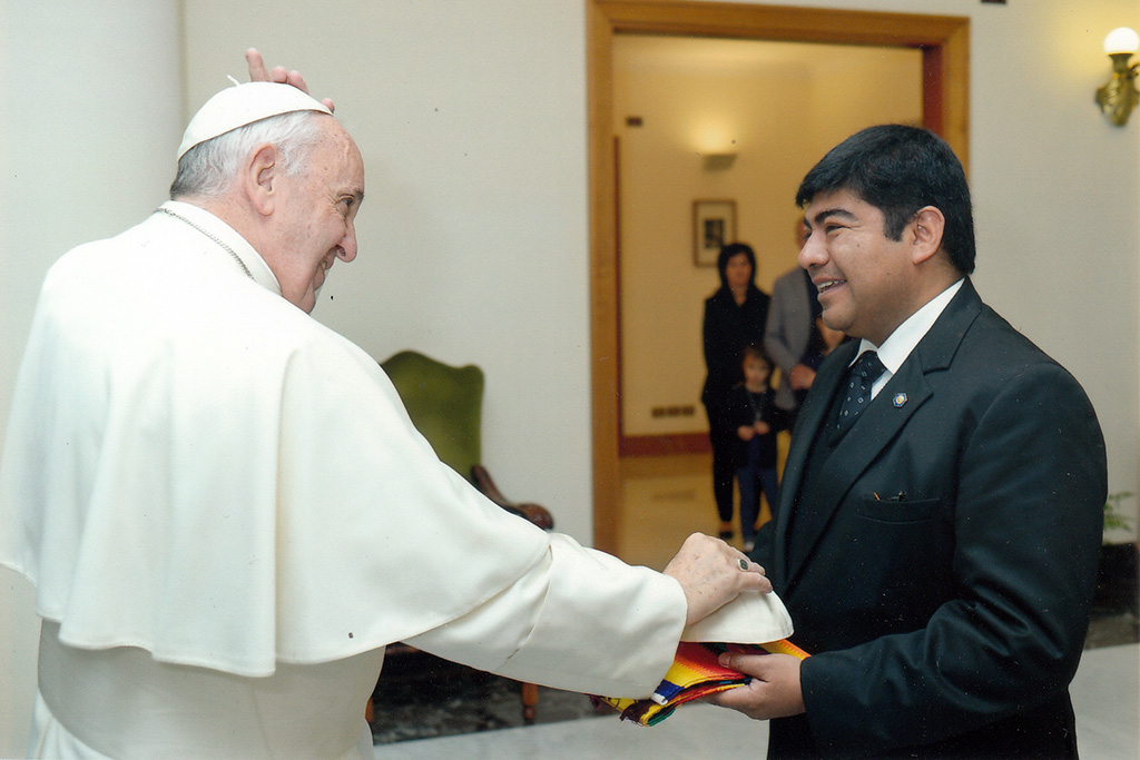Roma, julio 2016.- Su santidad el Papa Francisco recibió en audiencia especial a Don Raul Vásquez, director del Centro de Formación Profesional Padre Bartolomé Ambrosio, SDB. El Papa ofreció como recuerdo personal uno de sus solideos. Este será expuesto en un lugar especial dentro de la Capilla Pinardi dentro del CFP.