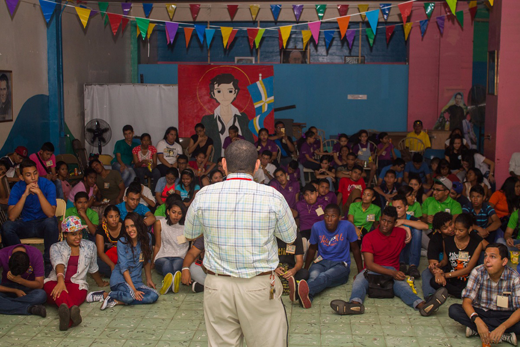El padre William Arguello presentando el mensaje del rector mayor "Como don Bosco MISERICORDIOSOS COMO EL PADRE", en el Festibosco 2016 que es animado por los salesianos cooperadores y sus destinatarios el Movimiento Juvenil Salesiano. 4 de Sept del 2016. Panamá.