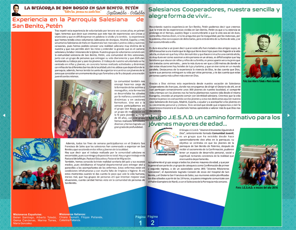 Petén, Guatemala, septiembre 2016.- El equipo de comunicaciones de la Parroquia de San Benito de Palermo a realizado "La Bitácora de Don Bosco en San Benito, Petén" como medio de difusión de las actividades de la parroquia. Para visitar esta iniciativa de comunicación pueden entrar a: https://www.flipsnack.com/boletinsalesianodepeten/la-bitacora-de-don-bosco-en-san-benito-peten.html