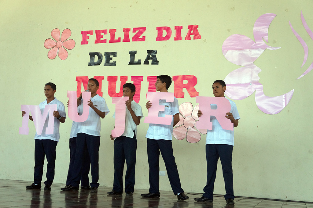 Granada, Nicaragua, marzo 2017.- Durante los buenos días del miércoles 08 de marzo, los miembros de la comunidad educativa del Colegio Salesiano realizaron la conmemoración de la efeméride del día de la mujer con un pequeño acto en donde las mujeres que laboran en la obra salesiana como docentes, personal administrativo y operativo y alumnas fueron las homenajeadas. Los varones prepararon este acto conmemorativo con la presentación de números artísticos como piezas folklóricas, cantos y acróstico.