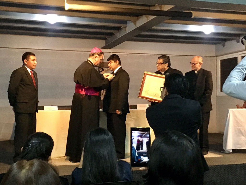 Guatemala, agosto 2017.- El miércoles 23 de agosto se llevó a cabo la entrega de la Condecoración Pontifica “Cruz Pro Ecclesia et Pontifice”, concedida por el Sumo Pontífice, Papa Francisco por el servicio a la Iglesia y a la Comunidad al señor Otto Raúl Vásquez Diéguez, Director del Centro de Formación Profesional Padre Bartolomé Ambrosio. La entrega fue hecha por el Sr. Nuncio Apostólico, Monseñor Nicolas Thenevin. En el acto estuvo presente Monseñor Oscar Julio Vián. SDB Arzobispo Metropolitano, miembros del cuerpo diplomático, la asociación de antiguos alumnos de Don Bosco, miembros de la familia salesiana, educadores, personal administrativo y amigos de la obra.
