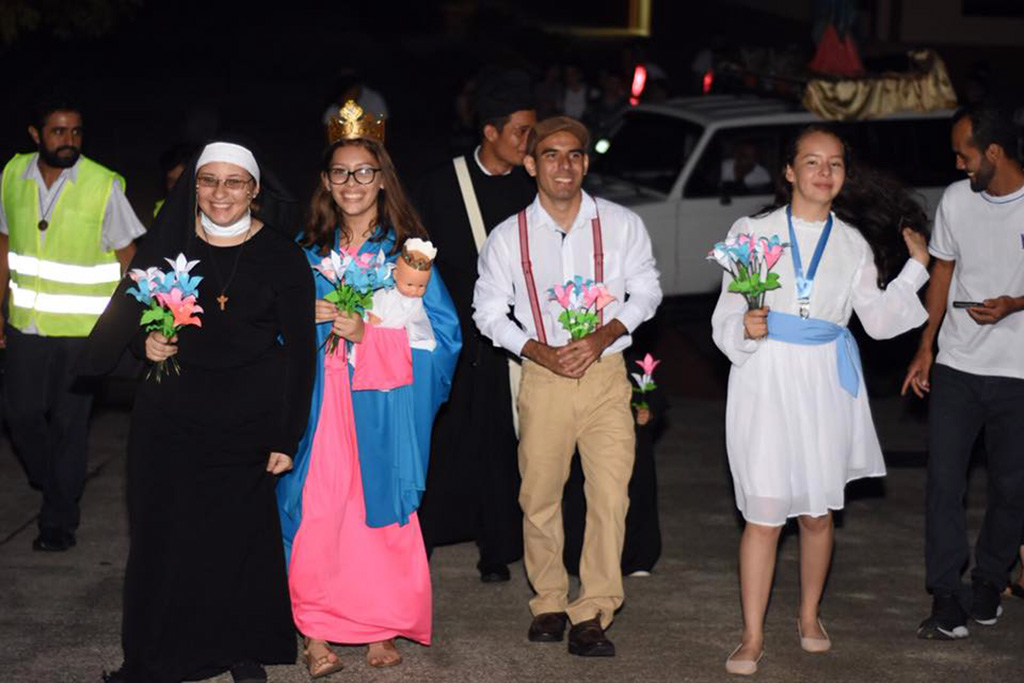 Costa Rica, San Isidro, junio 2018.- Pese a que en San Isidro no existe una cultura procesional, la Comunidad Educativo - Pastoral decidió sacar en procesión a María Auxiliadora. El grupo artístico del Centro, Io Sono Don Bosco animó el recorrido mediante la personificación de santos y santas de la familia salesiana. La Asociación de Devotos (as) de María Auxiliadora regalaron caramelos durante el recorrido, a los niños y niñas de los hogares por donde pasaba la Imagen, en particular, a los del Hogar AMA y del Patronato Nacional de la Infancia (PANI). Se finalizó la jornada con el rezo del rosario y la presentación de una obra teatral.