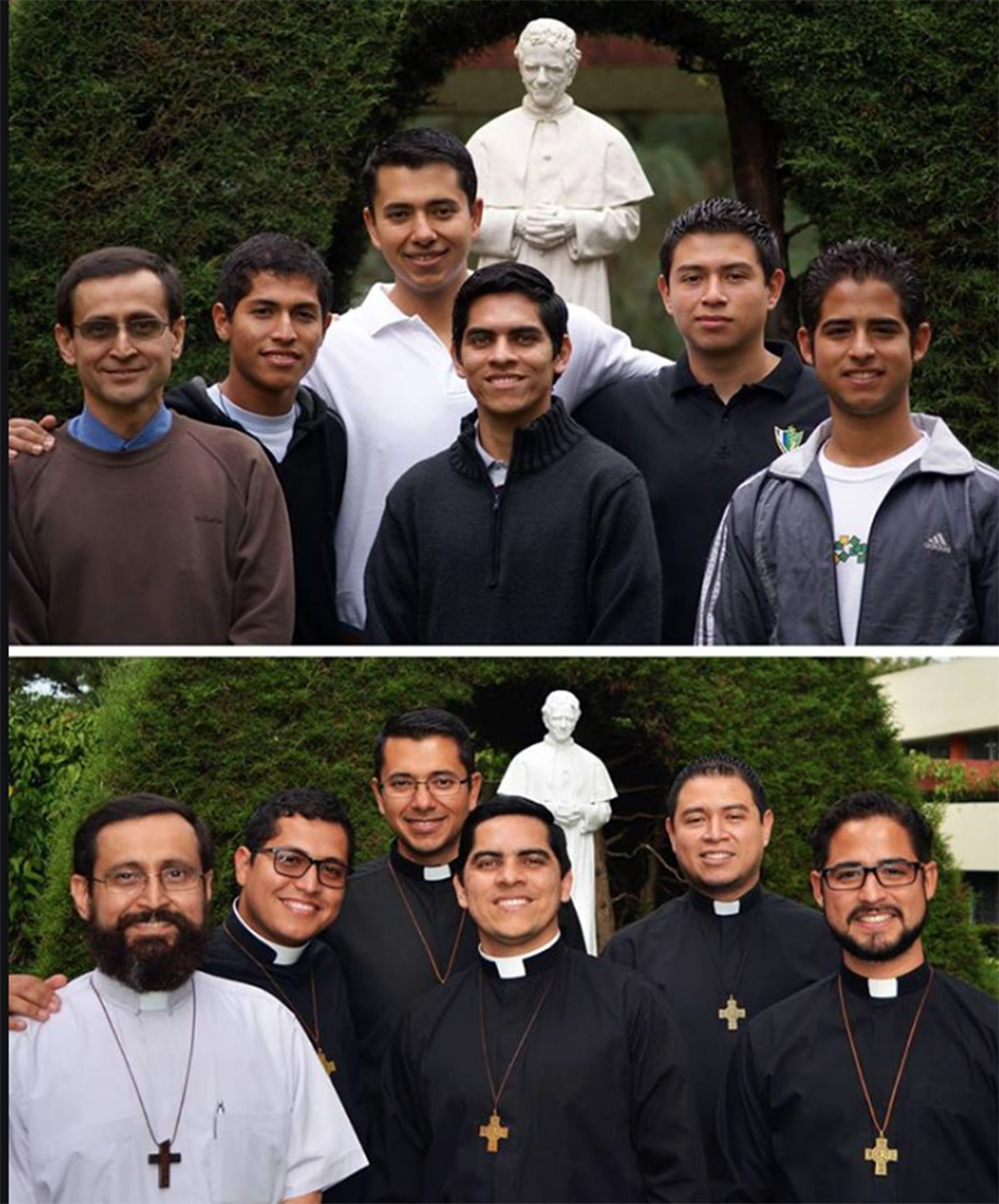 Guatemala, agosto 2018.- Un hermoso recuerdo del grupo de los actuales diáconos salesianos. La primera foto fue tomada en el año 2009, cuando apenas iniciaban su camino formativo. Ahora, a pocos meses de su ordenación sacerdotal repiten el recuerdo junto a quien fue su formador P. René Guzmán SDB.