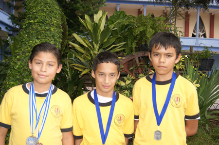 El Salvador, Santa Tecla, junio 2010.- Alumnos del Colegio Santa Cecilia que han obtenido medallas en competencias deportivas. De izquierda a derecha: José Daniel Ramos Portillo, 10 años, taekuando, 2 lugar en formas y 3 lugar en combate. Fernando Milorth Alvarenga Campos, 10 años, gimnasia, 1 lugar en paralelas, 1 lugar en salto, 4 lugar en piso. En Retalhuleu ganó 7 premios quedando en 4 lugar en competencia centroamericana. Jorge Ernesto Girón Rendón, 12 años, ajedrez, medalla de plata departamental, 3 lugar nacional.