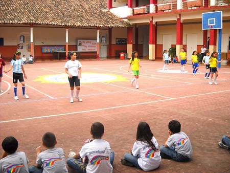El Salvador, Santa Tecla, junio 2010.- Niñas de la Escuela Normal Mazzarello presentando las coreografías del mundial. Hasta los más pequeños difrutan de esta fiesta mundialista.