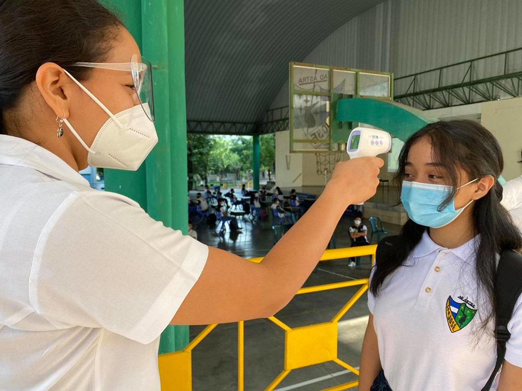 Santa Ana, El Salvador, abril 2021. - El pasado 12 de abril, se dio inicio a las clases semipresenciales para los estudiantes de bachillerato bajo estrictos controles de bioseguridad y un protocolo especial de higiene que, entre sus lineamientos está establecido la desinfección de las áreas utilizadas por los jóvenes durante los dos recesos de la jornada, asimismo se establece que los estudiantes pueden quitarse la mascarilla mientras estén comiendo y armar sus pequeños clusters.