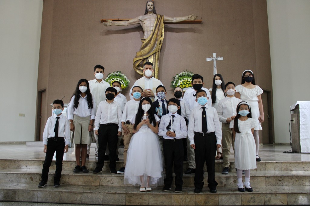 Tegucigalpa, Honduras, julio 2021. El pasado sábado 26 de junio, durante una misa especial, P. Mauricio Dada, SDB, dio la bienvenida a jóvenes del Instituto San Miguel, como nuevos miembros de la Iglesia católica a través del sacramento del bautismo.