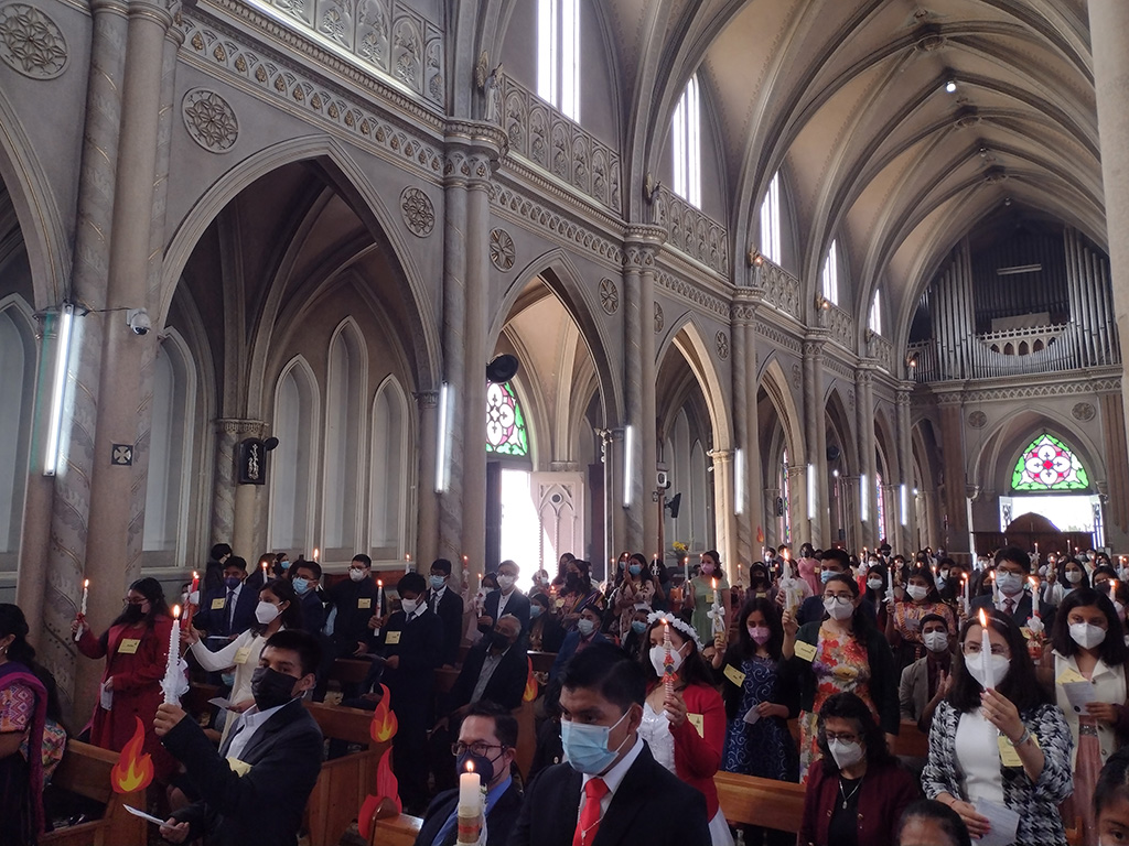 Quetzaltenango, Guatemala, octubre 2022. – El sábado 15 de octubre, 120 jóvenes recibieron el sacramento de la confirmación de manos del obispo auxiliar Manuel Cua en la parroquia San Nicolás. El padre Carlos Macz, sdb concelebró junto al obispo. Algunos de los confirmados se integraron a los grupos del MJS local.