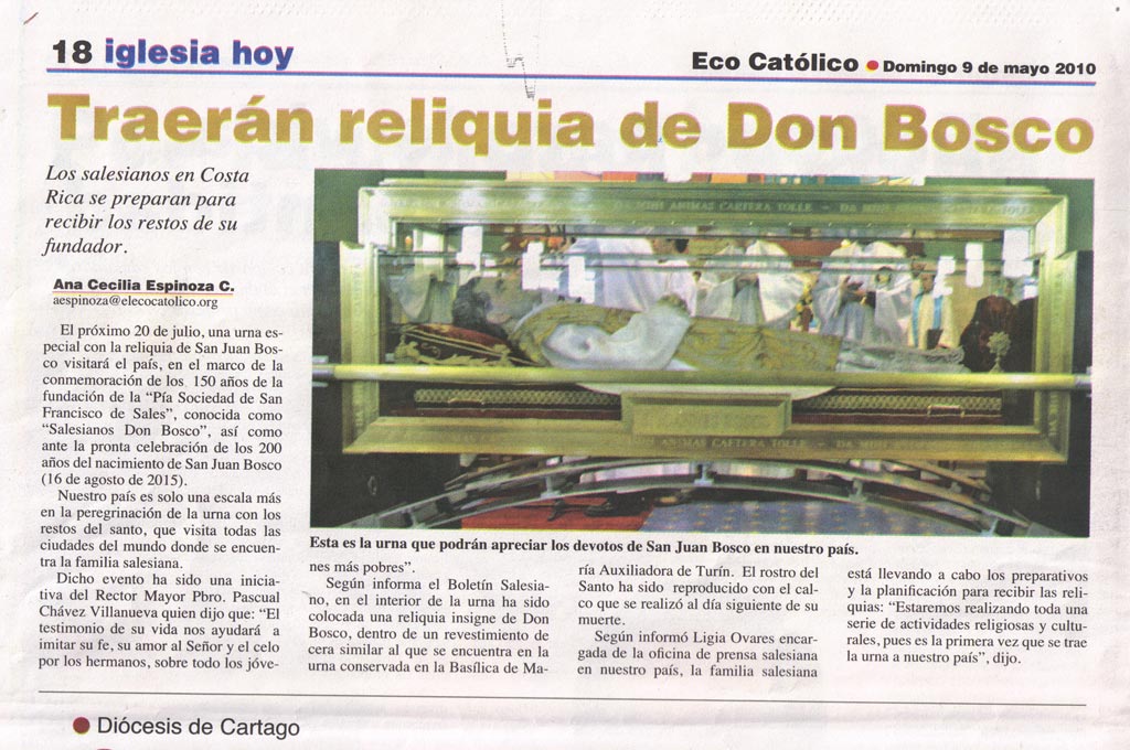 Preparan la visita de la Reliquia de Don Bosco El Diario de Hoy El Salvador Martes 4 de Mayo de 2010 |